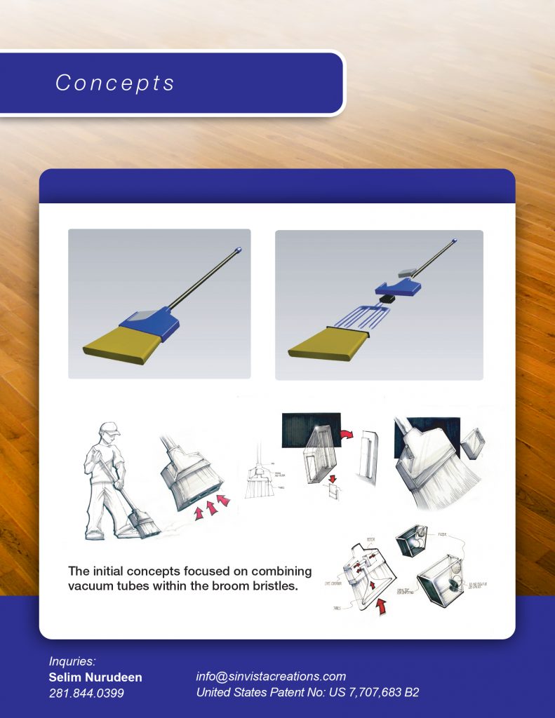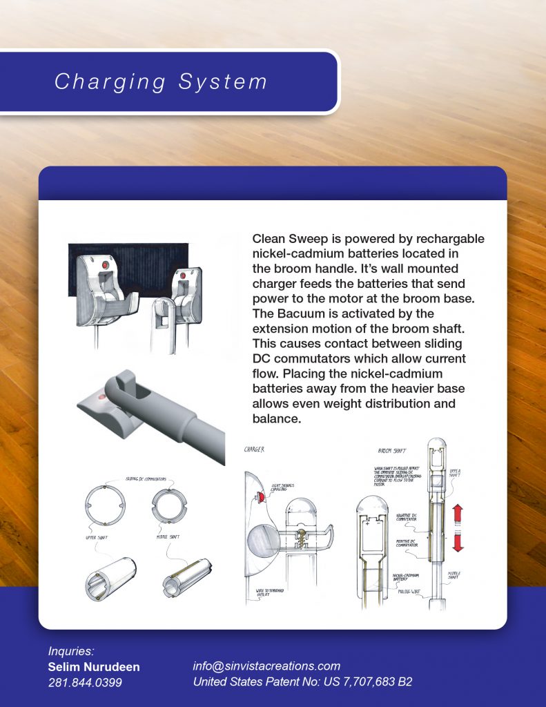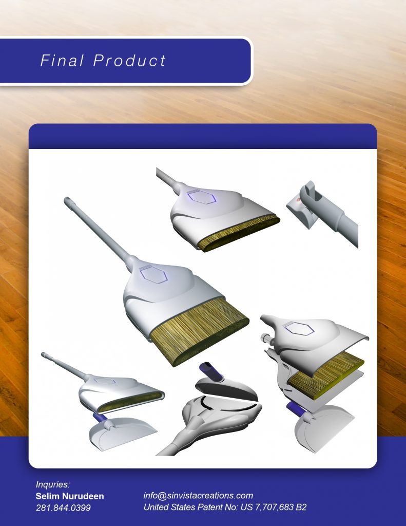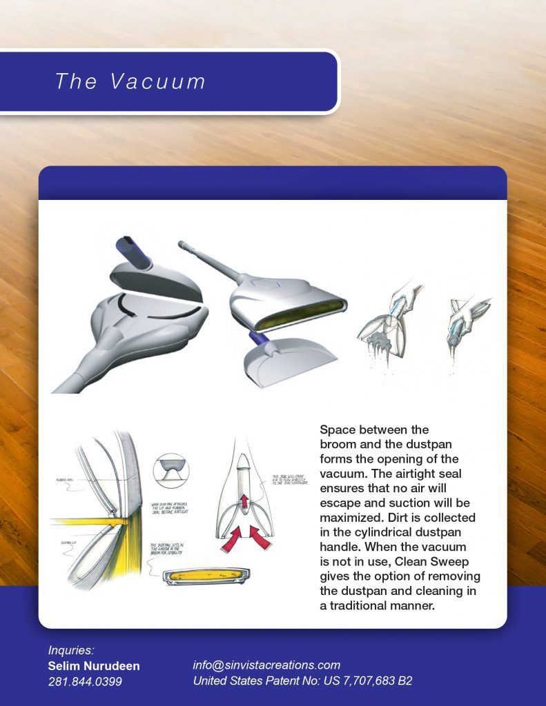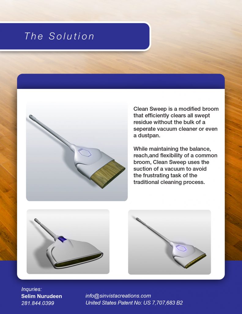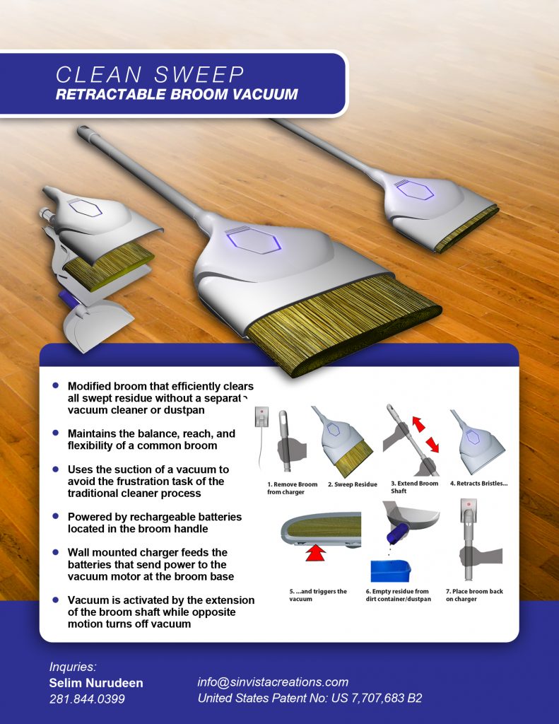 Clean Sweep is a U.S. Patented cleaning device that efficiently clears all swept residue without the bulk of a separate vacuum cleaner or even a dustpan. While maintaining the balance, reach and flexibility of a common broom. Clean Sweep functions as a regular broom until it is time to remove the swept residue. The broom shaft is extended which retracts the bristles, allowing the vacuum located at the base to touch the floor and effeciently remove the dirt.