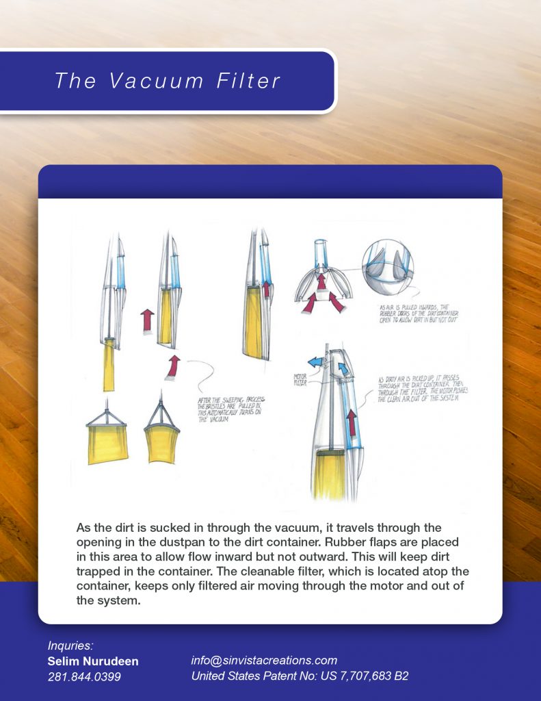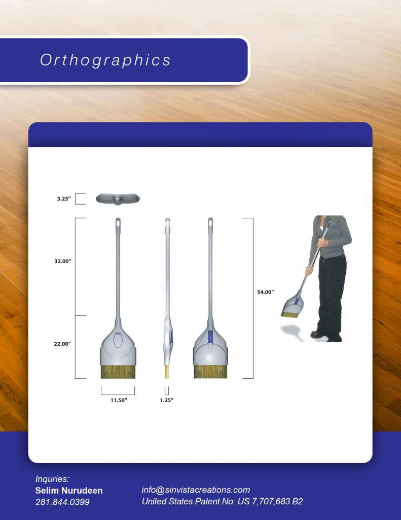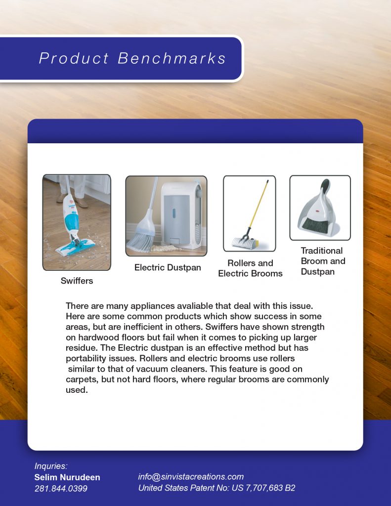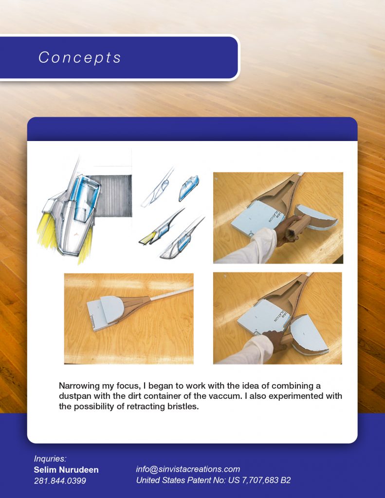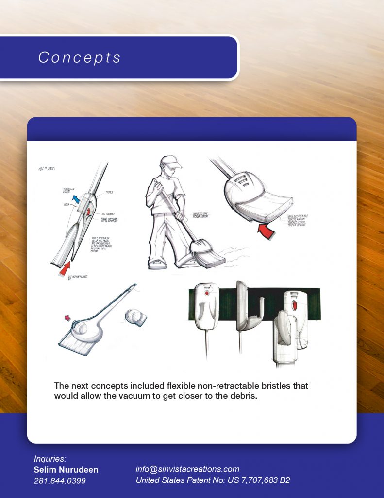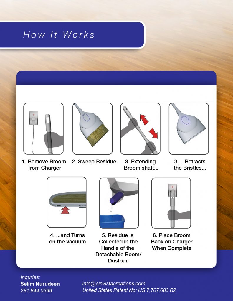 Clean Sweep is a U.S. Patented cleaning device that efficiently clears all swept residue without the bulk of a separate vacuum cleaner or even a dustpan. While maintaining the balance, reach and flexibility of a common broom. Clean Sweep functions as a regular broom until it is time to remove the swept residue. The broom shaft is extended which retracts the bristles, allowing the vacuum located at the base to touch the floor and effeciently remove the dirt.